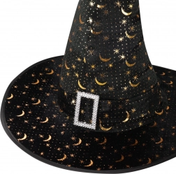Vytvořte si dokonalý čarodějnický kostým s tímto elegantním kloboukem v klasické černé barvě. Široká krempa a špičatý tvar dodávají autentický vzhled, zatímco zlaté hvězdy a půlměsíce se krásně třpytí a podtrhují mystickou atmosféru. Ozdobná spona u základny kuželu dodá celku šmrnc.