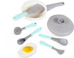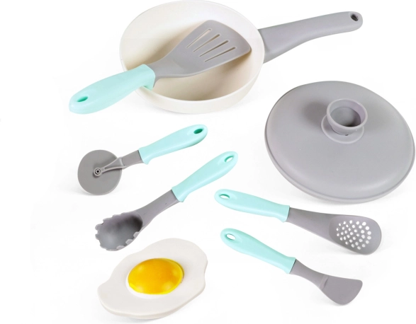 Děti si vyzkouší vaření s poklicemi, rukojeťmi i „volským okem“. Ideální pro rozvoj fantazie a role-play v dětské kuchyňce.