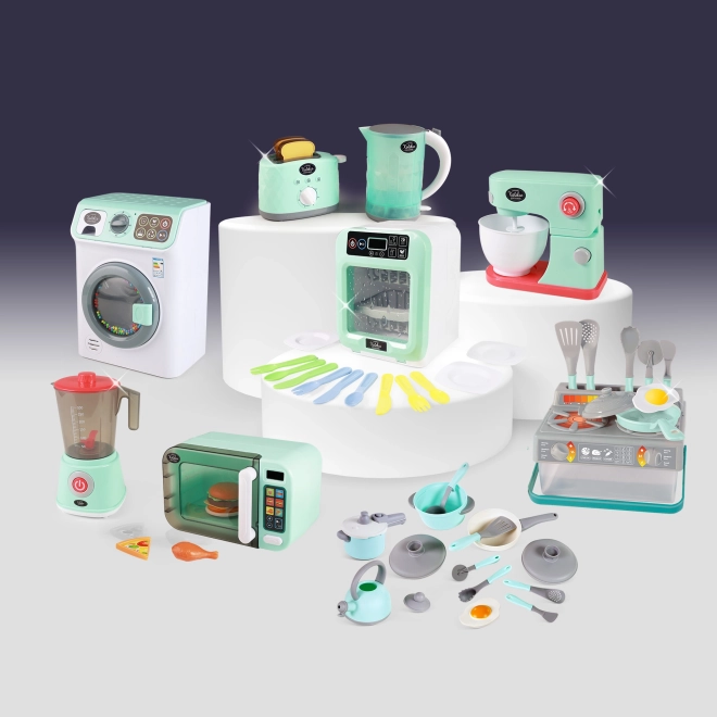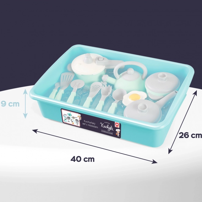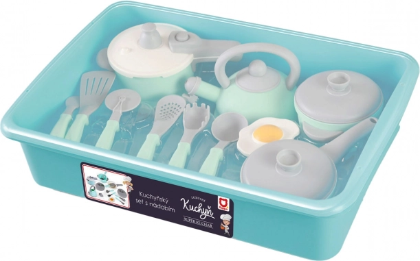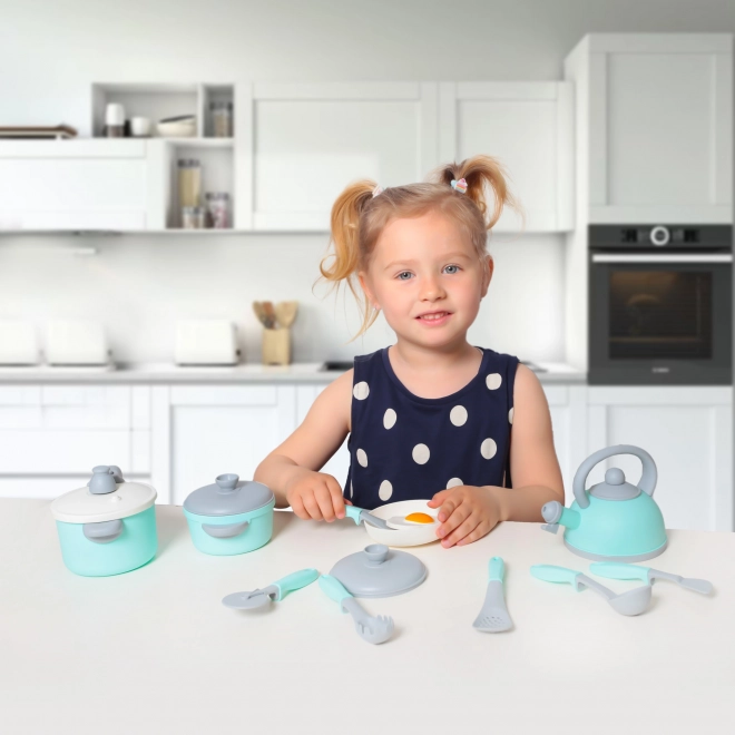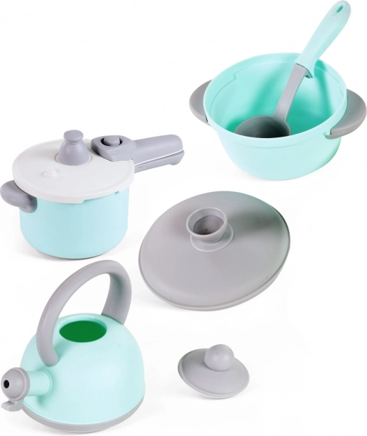 Tato stylová kuchyňská sada v tyrkysovo-šedém provedení inspiruje děti k kreativnímu a nápaditému vaření. Díky realistickým detailům, jako jsou hrnec s poklicí, pánev, konvice a pestrá škála kuchyňských pomůcek, si děti snadno osvojí základy stolování a role-play.