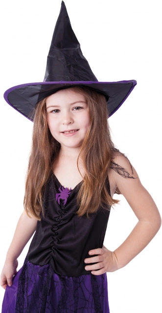 Proměňte svou holčičku v malou čarodějku během chvilky. Lehoučké šaty v černo‑fialových tónech s pavučinkovým dekorem a ladící špičatý klobouk zajistí kouzelný vzhled i pohodlné nošení po celý den.
