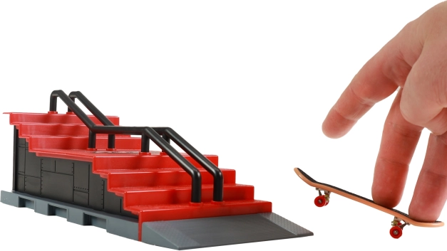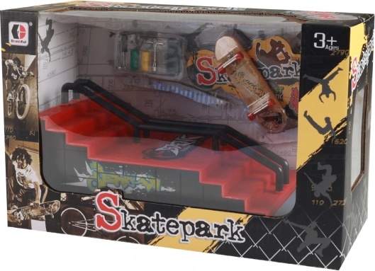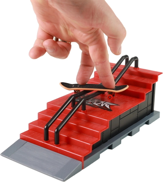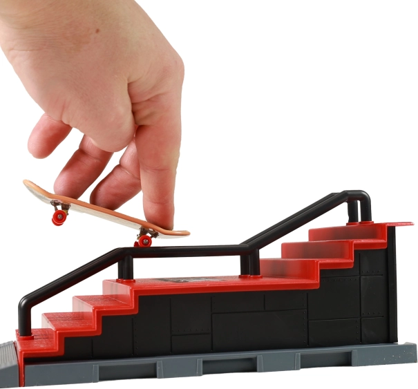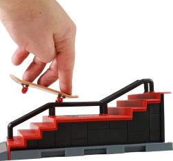 Vytvořte si vlastní fingerboardové dobrodružství s tímto mini skateparkem, který je ideální pro trénink triků. Set zahrnuje rampu se schodištěm a stabilním zábradlím, což vám umožní provádět různé triky, přesně jak na skutečném skateboardovém parku.