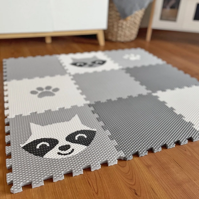 Hrací podložka se vyznačuje rozkošnými motivy mývalů a tlapek, které dodají hracímu prostředí hravý nádech.