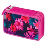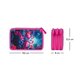 Prostorově úsporný penál se třemi oddělenými přihrádkami a stylovým designem s výraznými plameňáky, který upoutá každé oko.