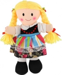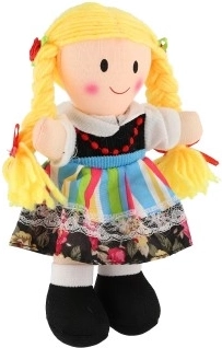 Panenka je oblečená v pestrých šatech s květinovými vzory, což z ní činí veselého a barevného společníka.