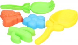 Kyblík, nástavec konvička, lopatka, hrábě, 3 formičky