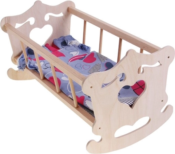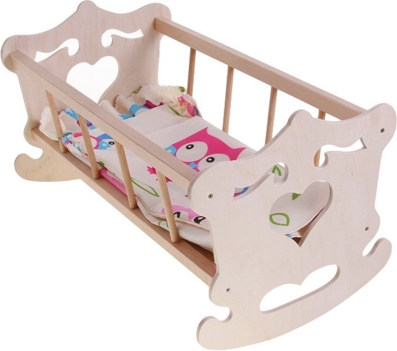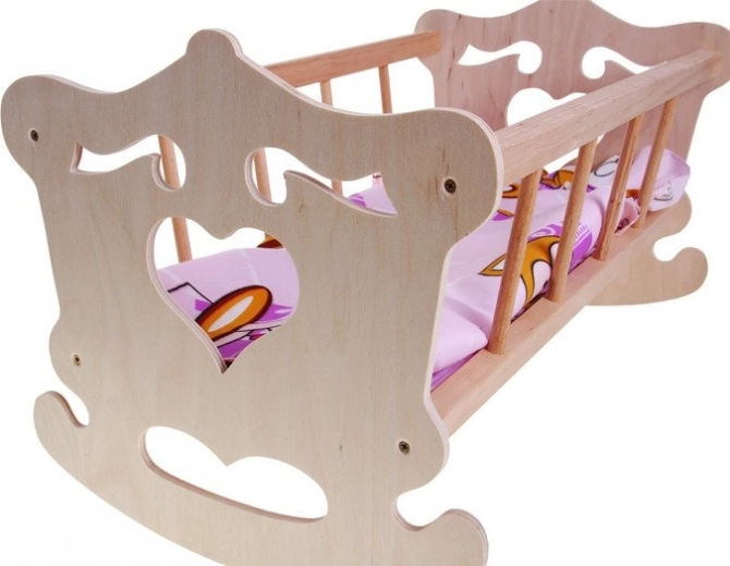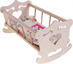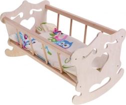 Roztomilá dřevěná kolébka pro panenky do výšky 50 cm s barevným povlečením je ideální pro hraní na maminku a tatínka. Je vyrobena z přírodního, nelakovaného dřeva, má houpací konstrukci a součástí je polštářek, peřinka a prostěradlo. Skvělý doplněk pro rozvoj fantazie a pečujících dovedností dětí.