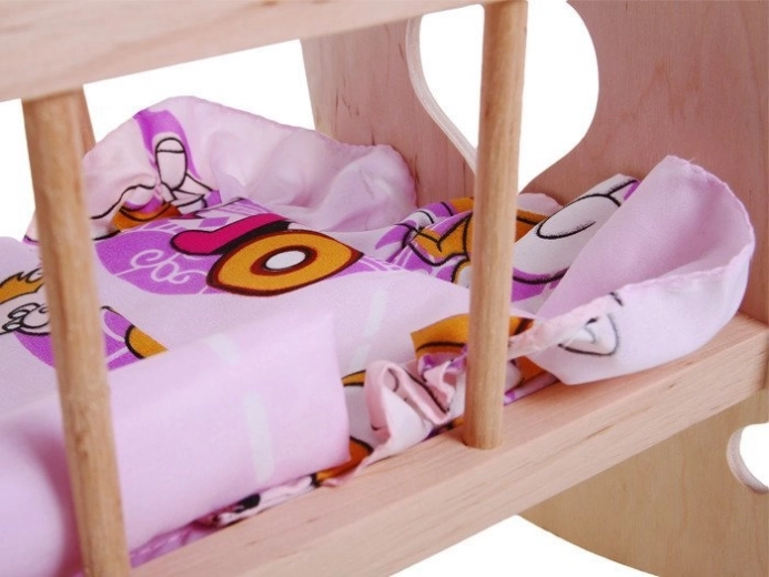 Tato kvalitně zpracovaná kolébka z přírodního dřeva nabídne panenkám a plyšákům pohodlné místo ke spánku. Díky jemnému houpání děti snadno uklidní své hračky, zatímco barevné povlečení dodá celé postýlce veselý vzhled.