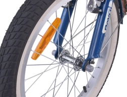 O bezpečné zastavení se starají hliníkové brzdy V‑brake s páčkami přizpůsobenými dětským rukám. Viditelnost zajišťuje sada odrazek vpředu, vzadu i ve výpletu kol. Pneumatiky 2.125" se spolehlivým záběrem si poradí s různými povrchy, zatímco kryt řetězu a kovové blatníky chrání oblečení. Pro první kilometry nechybí pomocná kolečka a praktický proutěný košík na drobnosti.