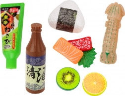 - rýže, hůlky, wasabi, surimi, losos, chobotnička, řasy nori, misky, kiwi, pomeranč, krevety, mušle, originální balení
