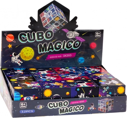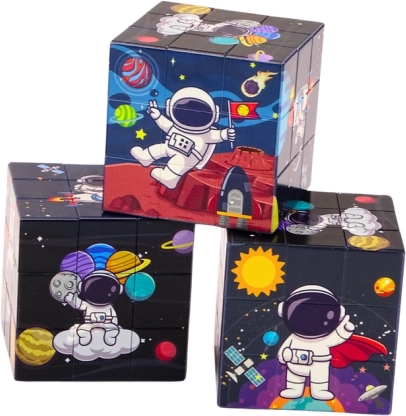 Magická kostka je navržena s veselými barvami a přátelskými ilustracemi, aby byla fascinující a zábavná pro malé milovníky astronomie. Děti mají za úkol složit obrázek s motivy, jako jsou kosmonauti a planety, což stimuluje jejich kreativitu.