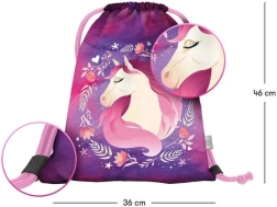 Odolný a omyvatelný sáček na obuv s motivem koně, který je ideální pro nošení sportovních věcí nebo drobností. Pevné tkanice také umožňují jeho pohodlné nošení na zádech.