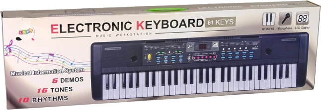 Rozviňte hudební talent vašeho dítěte s tímto dětským elektronickým klavírem se 61 klávesami, integrovaným mikrofonem a stojánkem na noty. Nabízí 6 demo skladeb, 16 tónů, 10 rytmů, 8 bicích zvuků, 2 výukové režimy, nahrávání, regulaci hlasitosti a tempa a efektní LED světla – ideální pro hravou výuku i domácí koncerty.