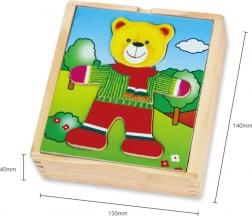Tato dřevěná vzdělávací hračka nabízí možnost složit šest obrázků roztomilého medvídka v různých náladách a kostýmech. Hlavní přínosy této hračky zahrnují nejen zábavu, ale také stimulaci manuální zručnosti a logického uvažování spolu s výukou rozpoznávání emocí.