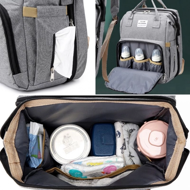 Praktický a stylový přebalovací batoh pro moderní maminky, který kombinuje prostornou organizaci s integrovanou cestovní postýlkou. Nabízí oddíly na lahvičky, kapsu na vlhčené ubrousky s rychlým přístupem a možnost nosit jej jako batoh, tašku i zavěsit na kočárek.