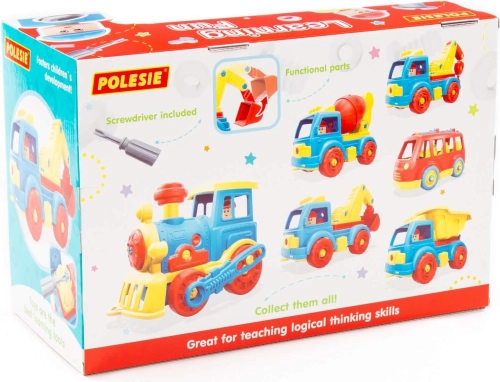 Součástí balení je plastový šroubovák a figurka stavbaře, kterou lze usadit do prostorné kabiny. Hračka je vyrobena z odolného plastu a splňuje normy CE a EN71.