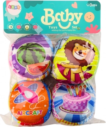 Sada 4 měkkých barevných míčků pro nejmenší přináší zábavu i učení v jednom. Každý míček má jiný motiv (zvířátka, ovoce, sladkosti, dopravní prostředky s anglickými popisky), obsahuje jemnou chrastítko a díky měkkému materiálu je bezpečný pro malé ručičky. Průměr 10 cm je ideální pro uchopení, kutálení i házení.