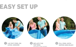 Montáž zvládnete bez nářadí: stačí vybrat rovnou plochu, nafouknout horní prstenec a napustit vodu. Pevné stěny z odolného materiálu a stabilní konstrukce se postarají o dlouhou životnost a nenáročnou údržbu.