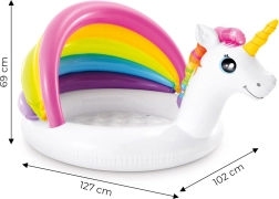 Dětský bazének jednorožec se stříškou přinese do vaší zahrady spoustu radosti a osvěžení v horkých dnech. Duhový oblouk vytváří příjemný stín, zatímco měkké nafukovací dno zvyšuje komfort při hraní a sezení. Kvalitní zpracování z pevného vinylu 0,25 mm zajišťuje dlouhou životnost a odolnost.