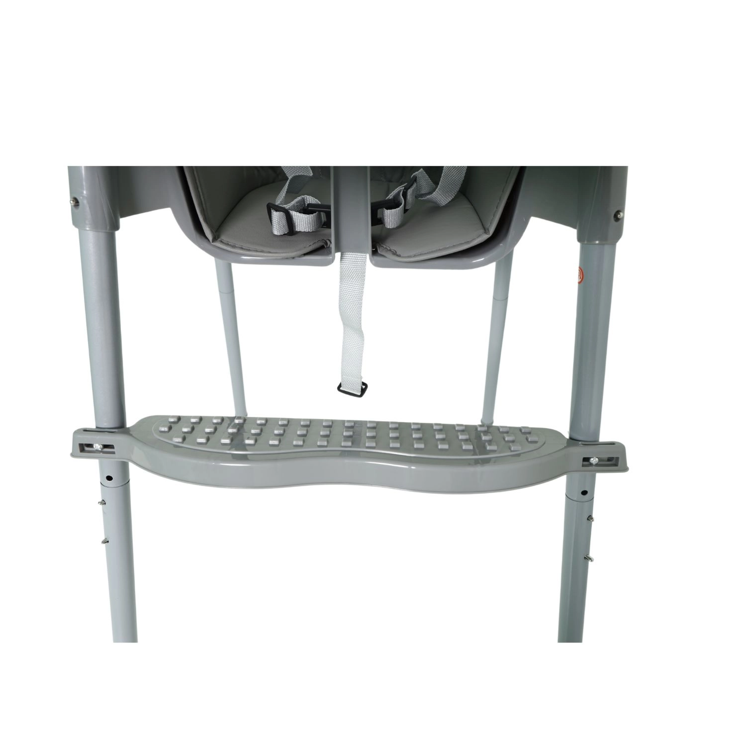 Široký rozklad nohou přibližně 46 × 46 cm a pevné trubkové nohy poskytují spolehlivou stabilitu. Vícebodové bezpečnostní pásy drží dítě v bezpečí během jídla i hry.