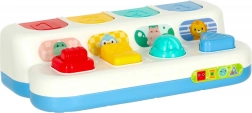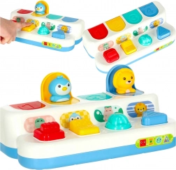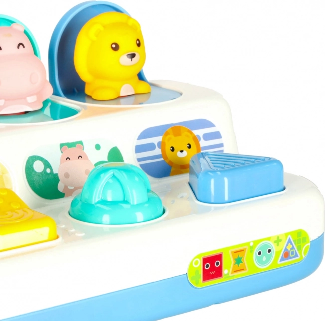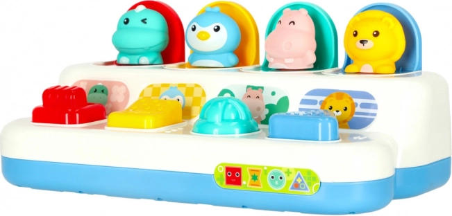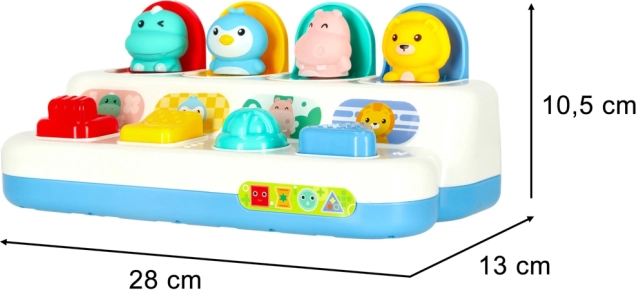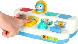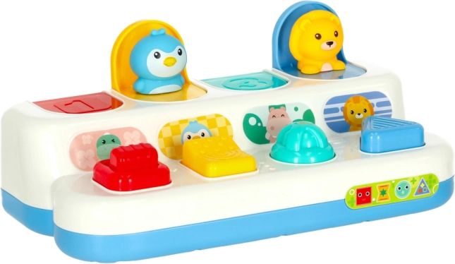 Barevné panely ukrývají krokodýla, tučňáka, hrocha a lva. Po stisku či posunutí ovladače zvířátko vyskočí a ozve se uspokojivé „klik“.