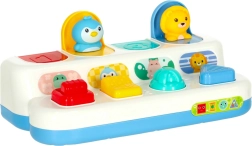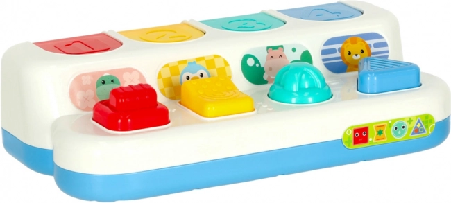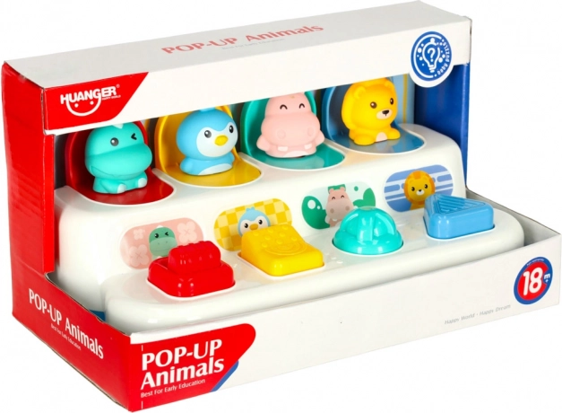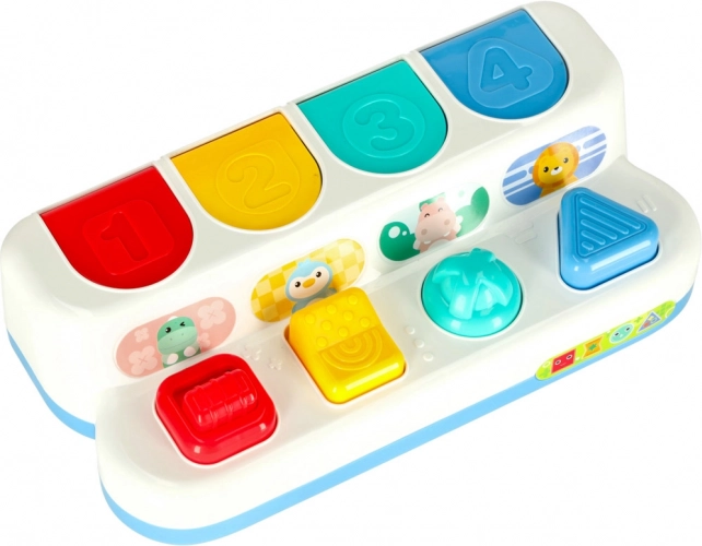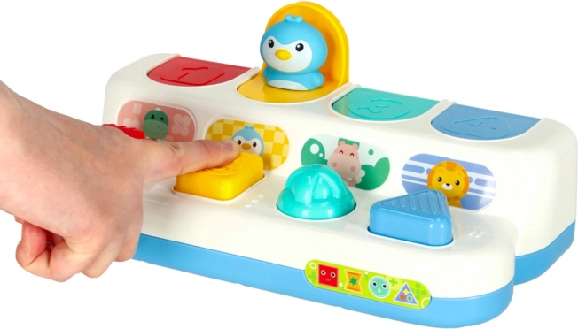 Tato interaktivní pop‑up hračka spojuje učení s hrou. Děti objevují barvy, tvary a čísla, současně si procvičují soustředění a logické myšlení. Každý panel má jiný mechanismus – stisknutí, posunutí nebo otočení – a po správné akci vyskočí roztomilé zvířátko. Charakteristické „klik“ podporuje sluchové vnímání.