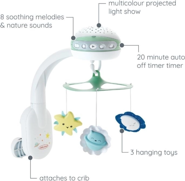 Uklidněte miminko jemným světlem, pohybem a hudbou. Tato 3v1 projektorová hudební kolotoč INFANTINO promítá barevné hvězdičky, přehrává 6 melodií a 2 zvuky přírody a po 20 minutách se automaticky ztiší. Díky chytrému zvukovému senzoru se do 120 minut opět spustí při zvuku, aby pomohla miminku znovu usnout.