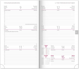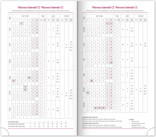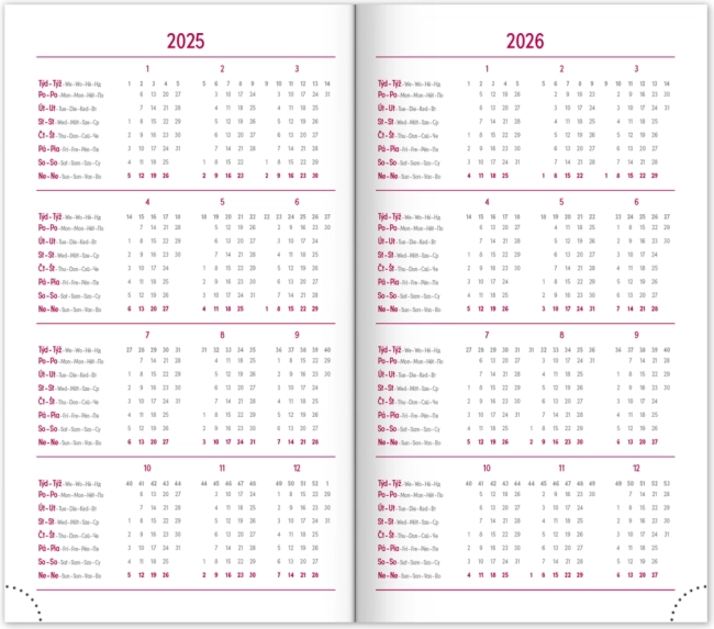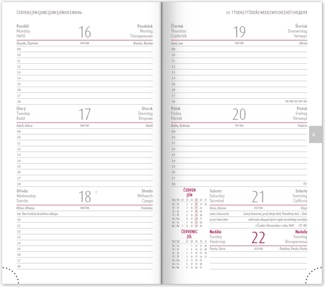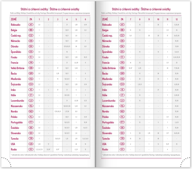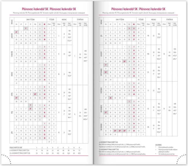 - Týdenní rozvrh s kalendáriem v češtině a slovenštině, s doplňky v angličtině, němčině, maďarštině a ruštině.