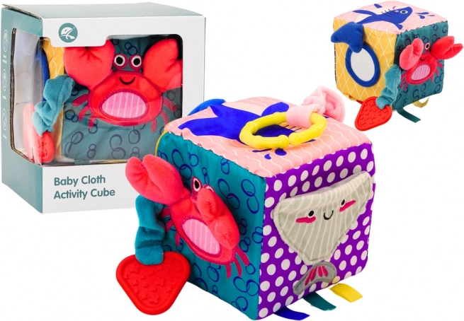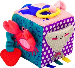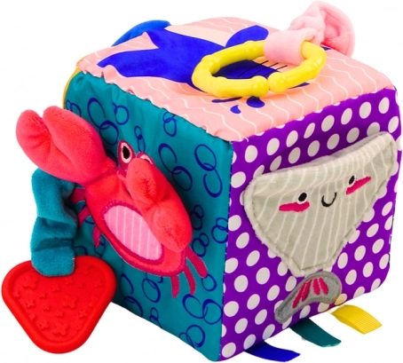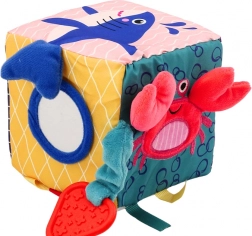 Ilustrace mořských zvířat (rekin, krab, hvězdice, rejnok) přitahují pozornost a podporují rané učení. Různé textury a zvuky stimulují smysly, zatímco tahání za šňůrky a manipulace s prvky posilují koordinaci oko–ruka a jemnou motoriku. Kostka splňuje normy CE a EN71 a je vhodná od prvních dnů života.