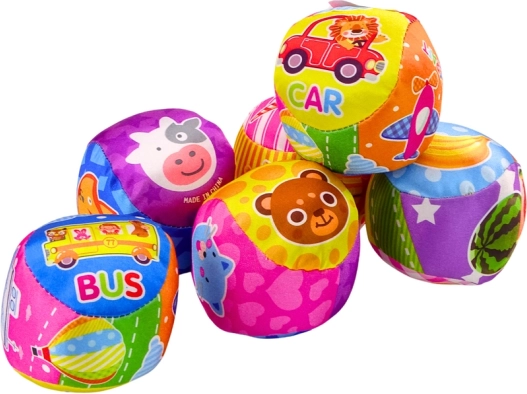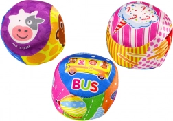 Měkký míček zdobený barevnými vzory zobrazujícími zvířátka a ovoce stimuluje představivost dítěte a přitahuje jeho pozornost díky intenzivním, živým barvám. Bezpečný a měkký materiál zajišťuje, že je ideální pro jemné ručičky dětí, a jeho lehká konstrukce zjednodušuje držení, kutálení a házení.