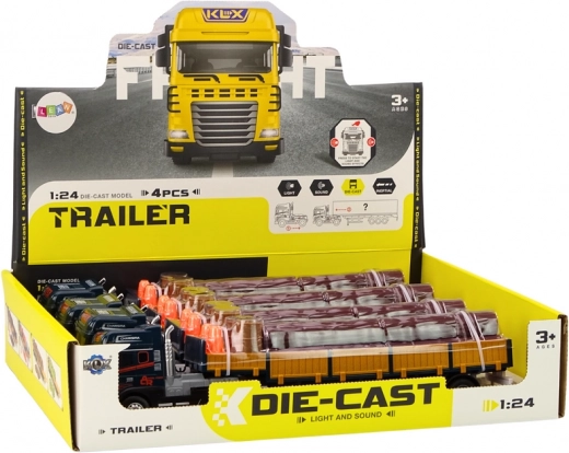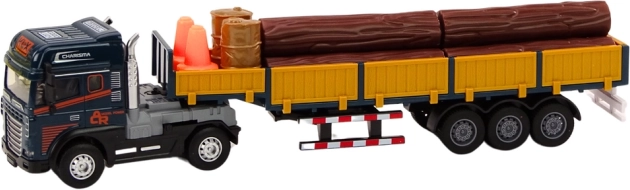 Realistický model nákladního auta v měřítku 1:24 nabízí modrou kabinu, odpojitelný návěs s odnímatelnými bočnicemi a náklad v podobě dřevěných klád. Pro ještě zábavnější hru má světelné a zvukové efekty (start motoru, couvání) a volnoběh/nápřah pro jízdu. Součástí jsou také přenosné kužely a dvě sudy pro scénáře nakládky a zabezpečení „staveniště“. Certifikace CE, shoda s EN71, vhodné od 3 let.