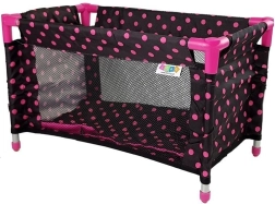 Stylová postýlka pro panenky Alice v černo‑růžovém designu s puntíky potěší každou malou maminku. Má průhledné síťované boky pro snadný dohled nad panenkou, pevnou hliníkovou konstrukci s růžovými plastovými spojkami a dodává se s polštářkem, peřinkou a praktickou přenosnou taškou. Vhodná pro panenky do 40 cm.