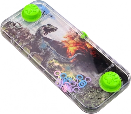 Kapesní vodní hra s motivem dinosaura Carnotauruse je jednoduchá, ale návyková hračka. V čirém vodním zásobníku se volně vznášejí barevné kroužky a vaším úkolem je pomocí dvou zelených tlačítek přesně dávkovat tlak tak, aby se kroužky nasadily na dva výstupky uvnitř.