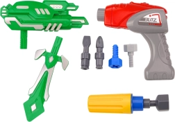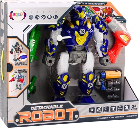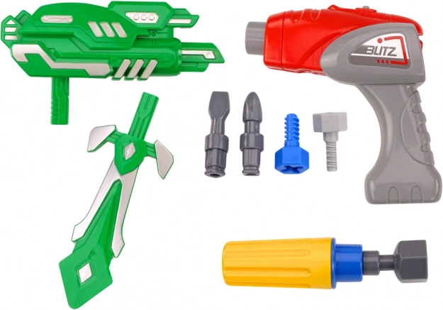 Souprava obsahuje vše, co je potřeba pro okamžitou hru: robota k montáži, hračkovou vrtačku s nástavci, meč a zbroj a baterie typu AG13. Díky robustnímu plastovému zpracování je ideální pro každodenní hraní a rozvoj technického myšlení.