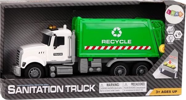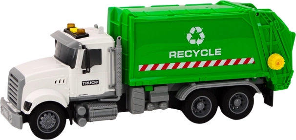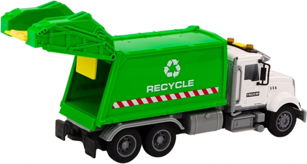 Hračka popelářského vozu v bílo-zelené barvě dokonale napodobuje skutečný vůz, odpovědný za svoz odpadu. Realistický vzhled a otevíratelná zadní část umožňují dětem simulovat sběr odpadu, což je skvělá příležitost k učení o odpovědnosti a důležitosti recyklace.