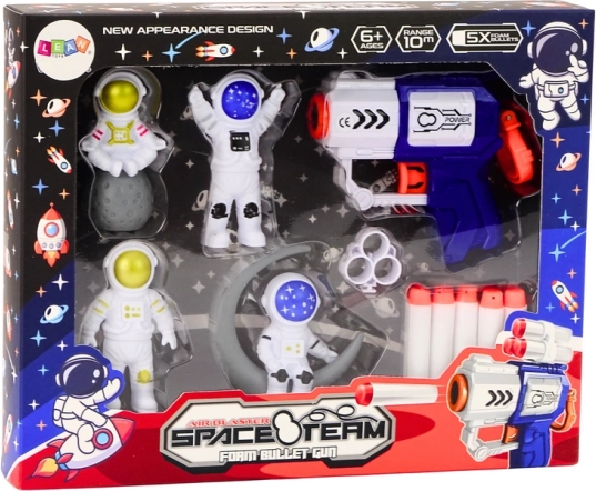 Tento kosmický set přenese děti do světa intergalaktických misí. Lehkou a dobře uchopitelnou pistolí mohou střílet měkké, elastické šipky, které jsou šetrné k nábytku i bezpečné pro hru doma. Figurky kosmonautů dodají hře příběh – poslouží jako cíle, rekvizity i dekorace.