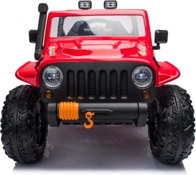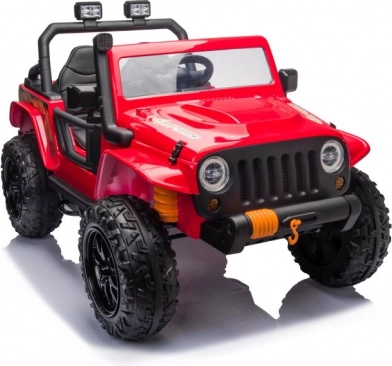 Červené elektrické auto pro děti je inspirované terénním off-road vozem. Díky velkým kolům a zvýšené světlé výšce si poradí s nerovným povrchem a nabídne zábavu na zahradě i na hřišti. Otevřená kabina, volant a světla podporují realistickou hru a rozvoj motoriky.