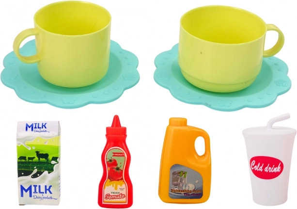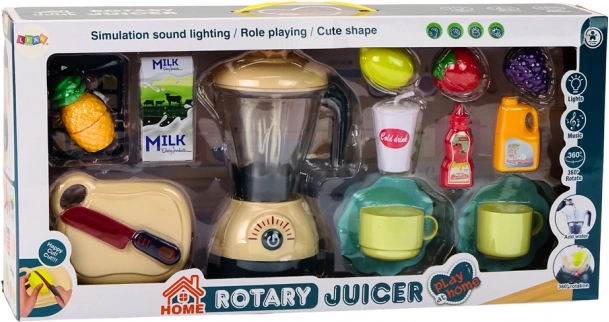 Zábavná kuchyňská sada pro nejmenší s elektrickým mixérem, který má světelné a zvukové efekty a otáčivou funkci. Děti mohou do nádoby nalévat vodu a sledovat víření „koktejlu“, krájet ovoce na suchý zip plastovým nožem na prkénku a servírovat do dvou šálků se spodky. Skvělá volba pro rozvoj jemné motoriky, představivosti a role-play v bezpečném provedení.