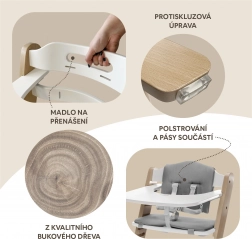 Bezpečnostní pás, protiskluzové nožky, měkké pratelné polstrování a netoxické barvy pro klidné a bezpečné používání.