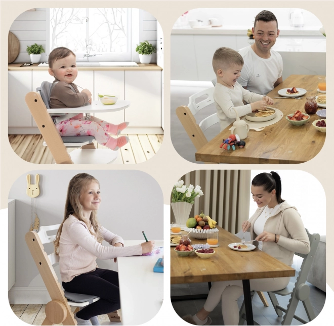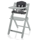 Masivní bukové dřevo zaručuje dlouhou životnost, odolnost a vysokou nosnost až 110 kg. Měkké pratelné polstrování, bezpečnostní pás a protiskluzové koncovky nohou se postarají o komfort i bezpečí při každém jídle. Ekologická volba s minimem plastů a snadnou údržbou.