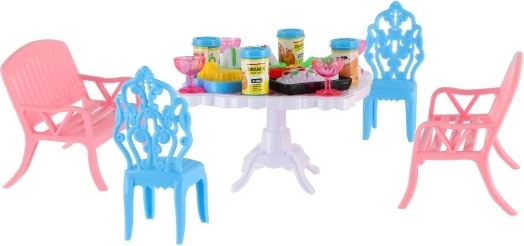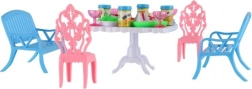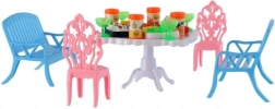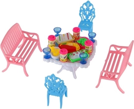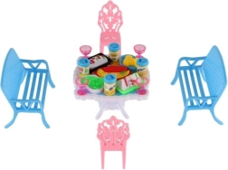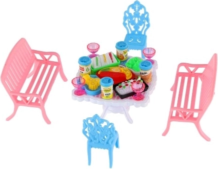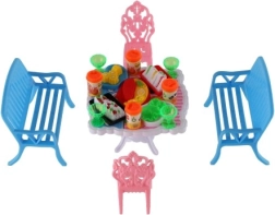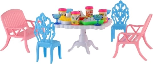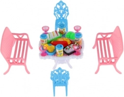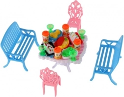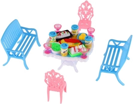 Sada obsahuje 2 lavičky, 2 židličky a stůl doplněné o 13 kusů příslušenství – skleničky, plechovky, talíře a tác. Vše potřebné pro hostinu vašich panenek.