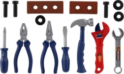 Součástí sady jsou typické nástroje jako kladivo, šroubovák, kleště či klíč, stejně jako matice a šrouby pro nácvik šroubování. Díky praktickému sáčku je uklízení i přenášení hračka – skvělé také jako dárek.