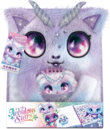 Fialovo‑pastelový design s třpytivými růžky, oušky a velkýma hvězdnýma očima. Deníček je radost držet i vystavit.