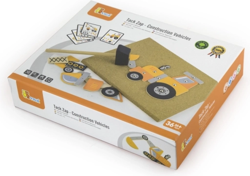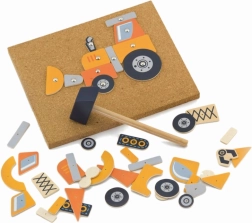 Kreativní korková přibíječka VIGA se stavebními vozidly nadchne malé stavitele od 3 let. Dřevěné tvary s otvory se pomocí pinesek a kladívka připevňují na tabuli – děti rozvíjejí jemnou motoriku, logické myšlení, kreativitu i koncentraci. Sada obsahuje 45 dílů, korkovou desku, kladívko, pinesky a karty se vzory stavebních strojů.
