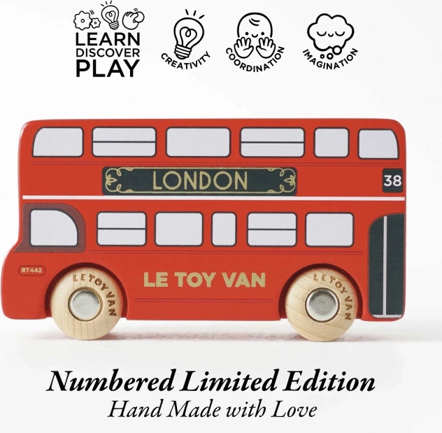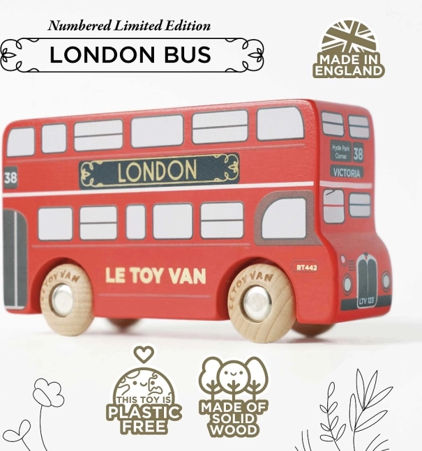 Vydejte se na dobrodružství s limitovanou edicí londýnského autobusu! Tato jedinečná hračka je pečlivě ručně očíslována a vyrobena z trvanlivého dřeva ve Velké Británii, přinášející autentický zážitek díky tradiční červené barvě a zlatým detailům.