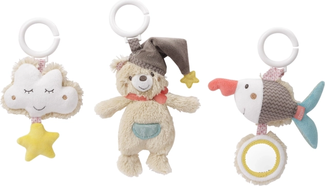 Tři roztomilé přívěsky s různými texturami a tvary podporují zrak, hmat i motoriku a udrží miminko zaujaté doma i na cestách.