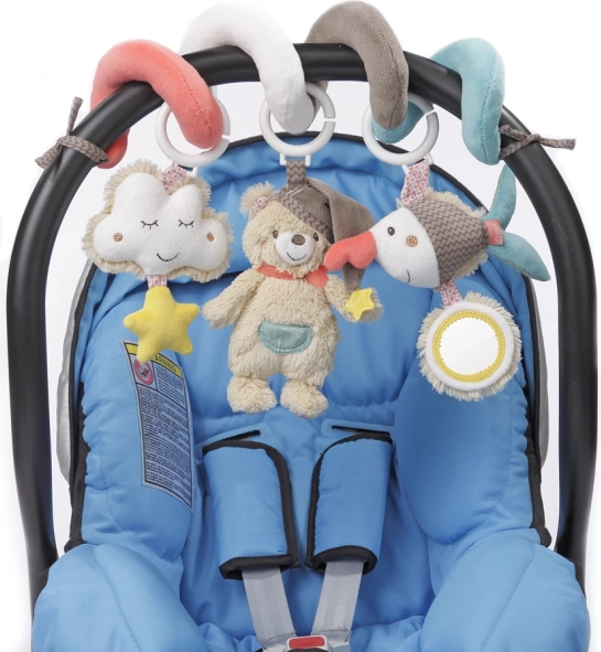 Tato univerzální aktivní spirála pro nejmenší promění postýlku, autosedačku i kočárek v zábavné a podnětné prostředí. Tři veselé přívěsky – mrak, medvídek a rybička – zaujmou různými tvary, texturami a pohybem, čímž podporují vizuální vnímání i koordinaci oko–ruka.