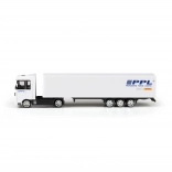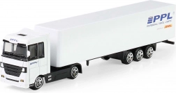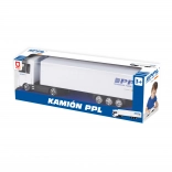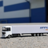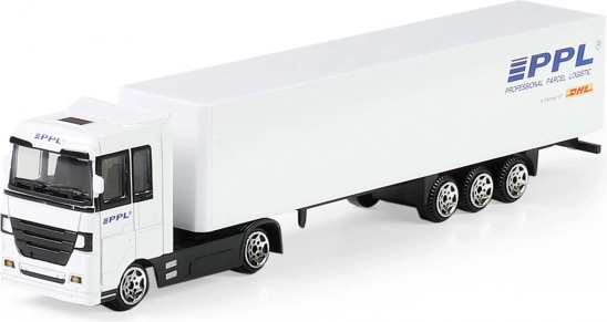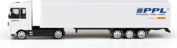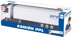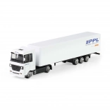 Objevte detailně zpracovaný model kamionu PPL, který věrně napodobuje skutečný logistický tahač. Kovové provedení kabiny dodává odolnost, přívěs z PVC s autentickým logem PPL zaujme na první pohled. Díky volnému chodu se model hladce pohybuje po rovném povrchu a je ideální pro hravou přepravu „zásilek“ i vystavení ve vitríně.