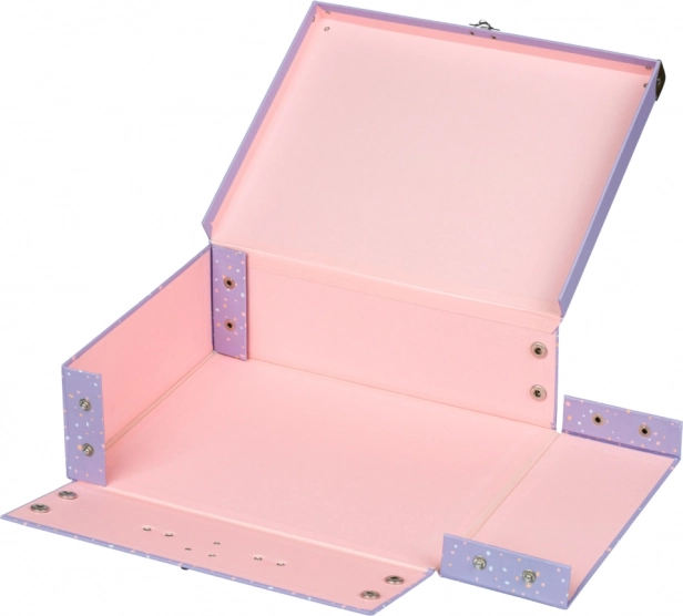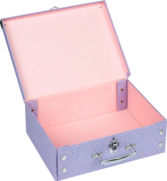 Kufřík kombinuje hravý design s praktickým použitím. Kovové ucho a okované rohy zajišťují odolnost a pevnost.