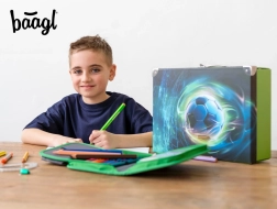 Skládací školní kufřík Baagl je ideální volba pro malé fotbalové fanoušky, díky jeho pevnému designu a stylovému fotbalovému motivu.