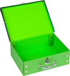 Kufřík je vyroben z laminovaného papíru a vybaven kovovými rohy pro odolnost proti opotřebení.